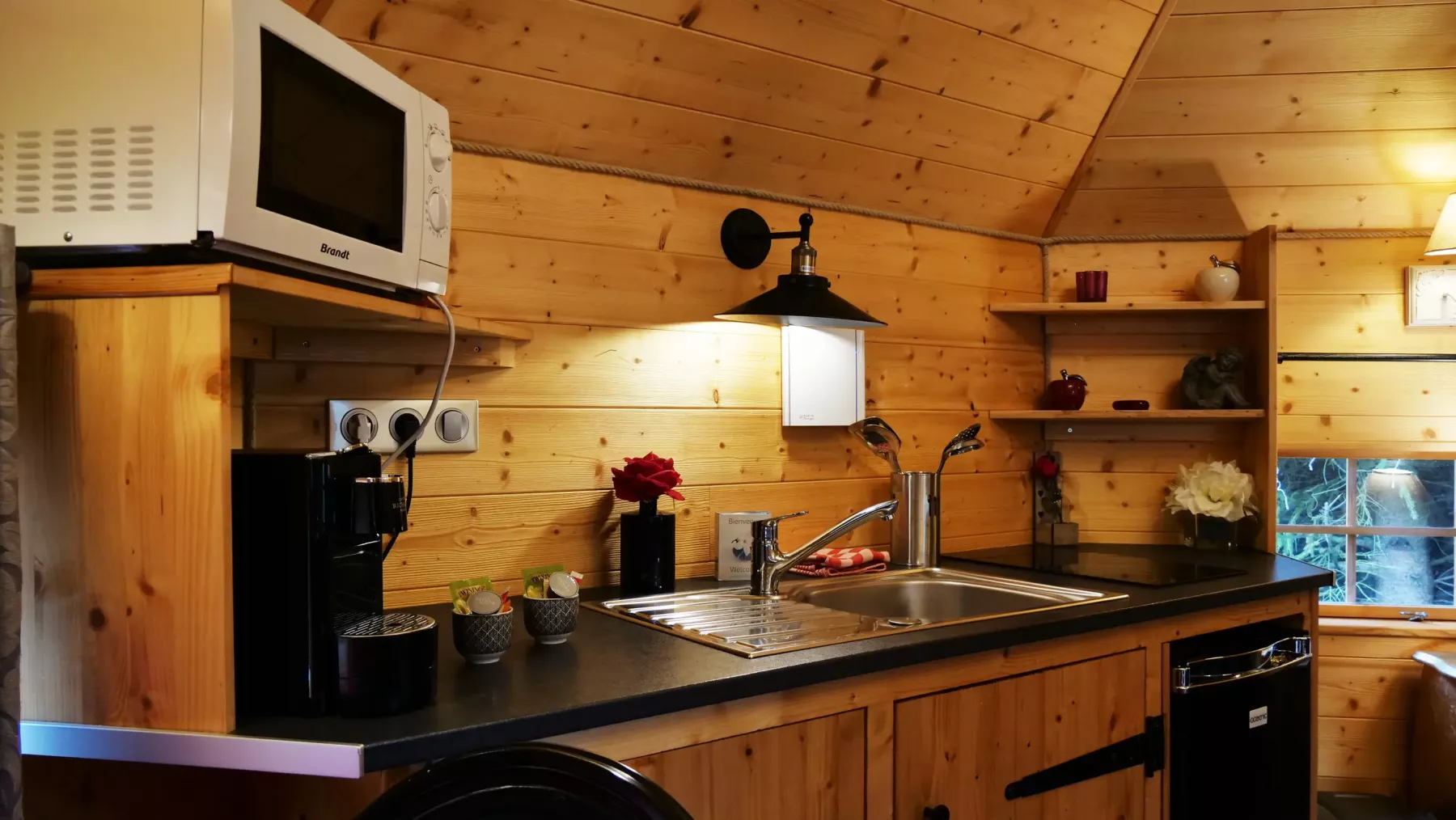 - Une cuisine ouverte équipée avec frigo, micro onde, plaque électrique et toute la vaisselle nécessaire