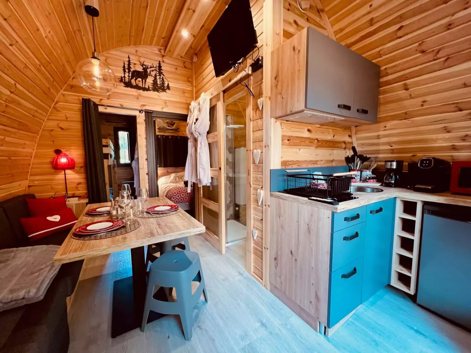 - Un séjour avec coin cuisine aménagé, frigo, plaque électrique et toute la vaisselle