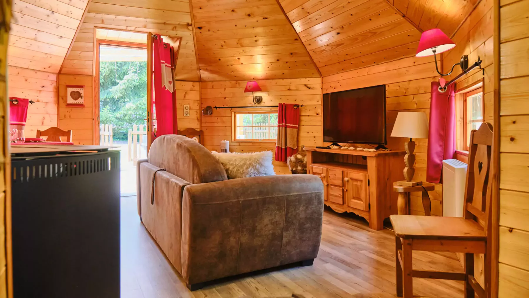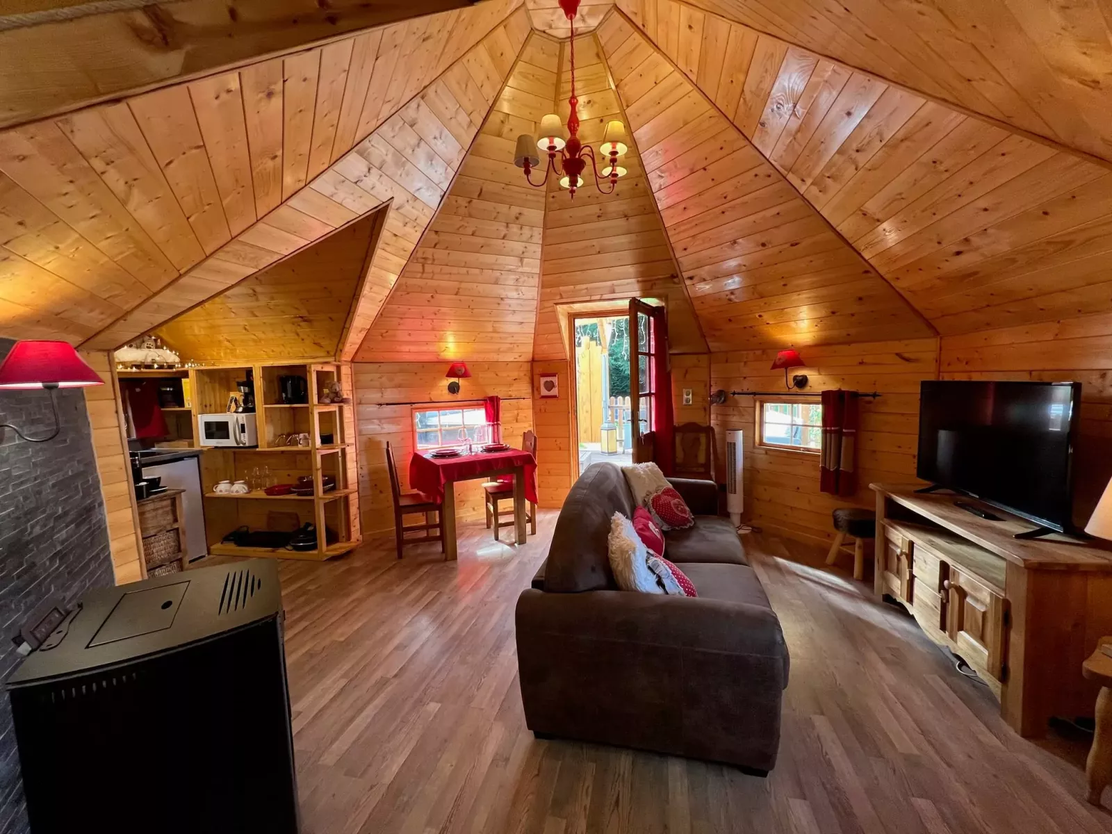 - Coin repas, canapé convertible, télévision et poêle à pellets