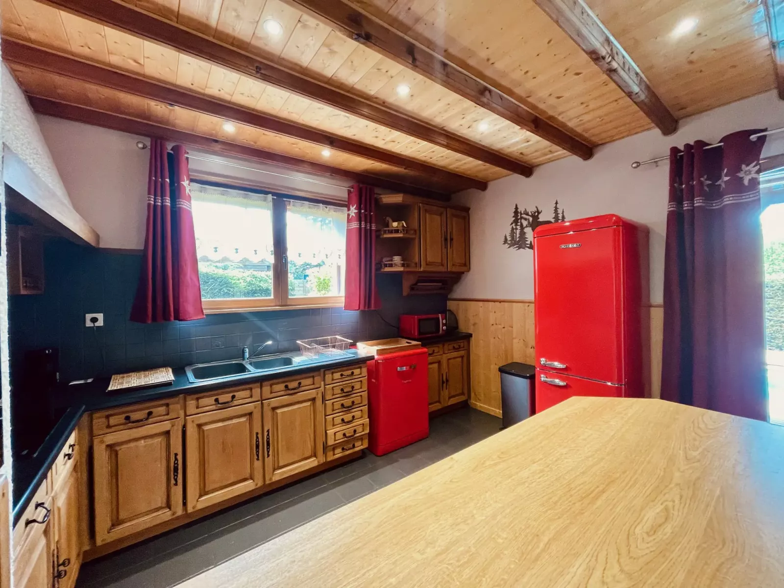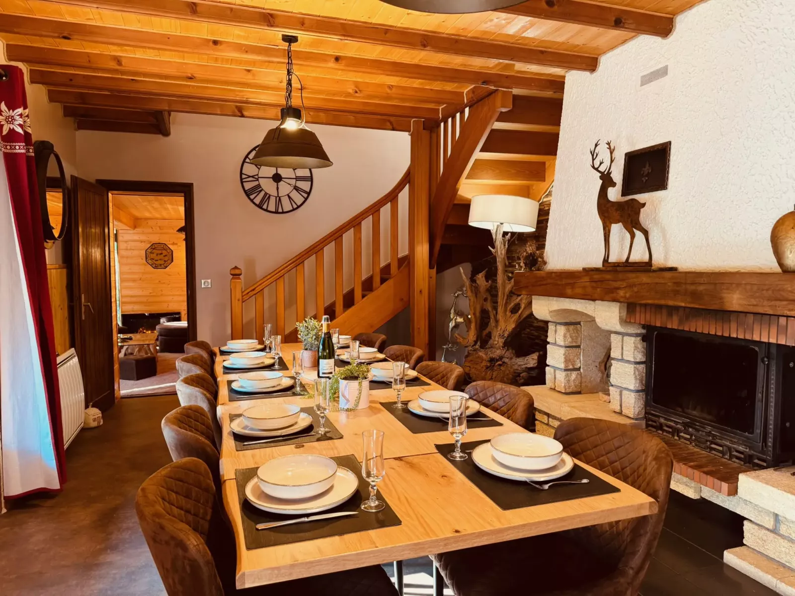 - Salle à manger avec cheminée, cuisine ouverte et équipée (micro-onde, machine à café Dolce Gusto, frigo et congélateur, plaque de gaz, tout équipement nécessaire, four, lave-vaisselle…)