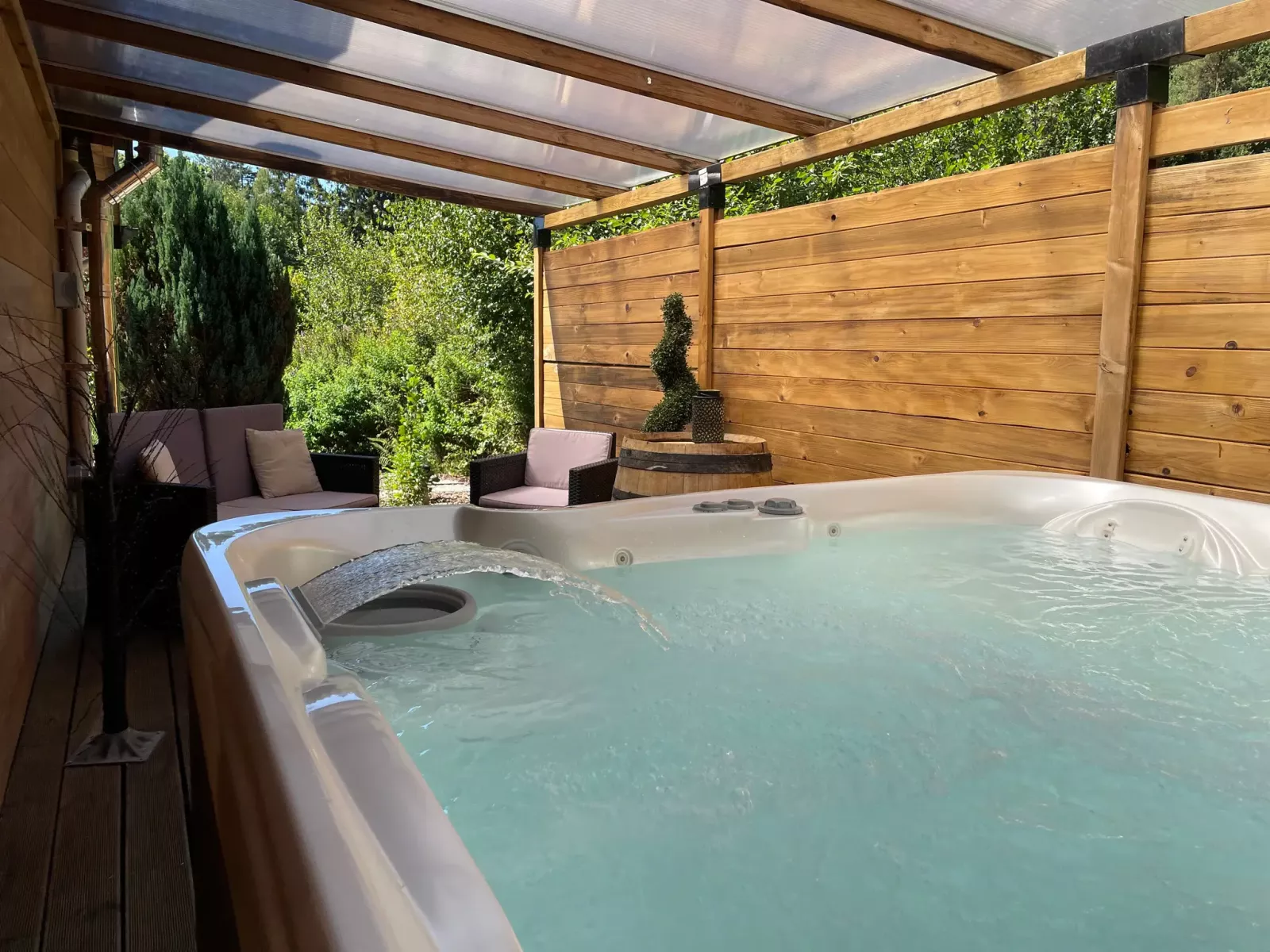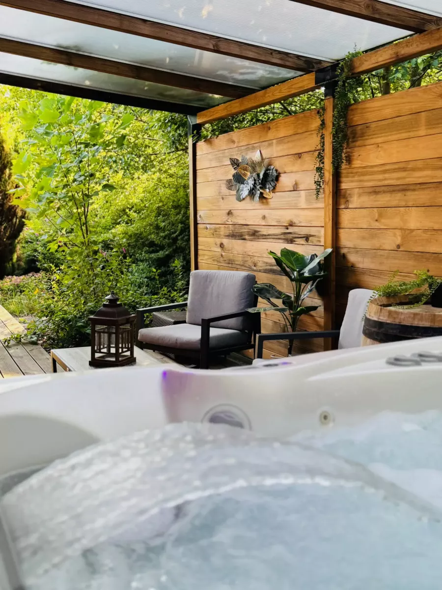 - Grand jacuzzi chauffé à 38°C accessible 24h/24h toute l’année, en toute intimité, sur grande terrasse privée avec barbecue