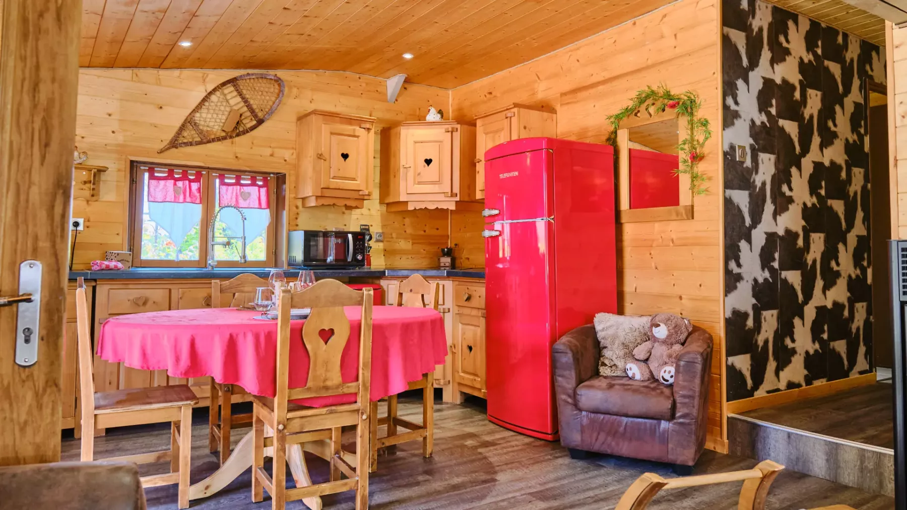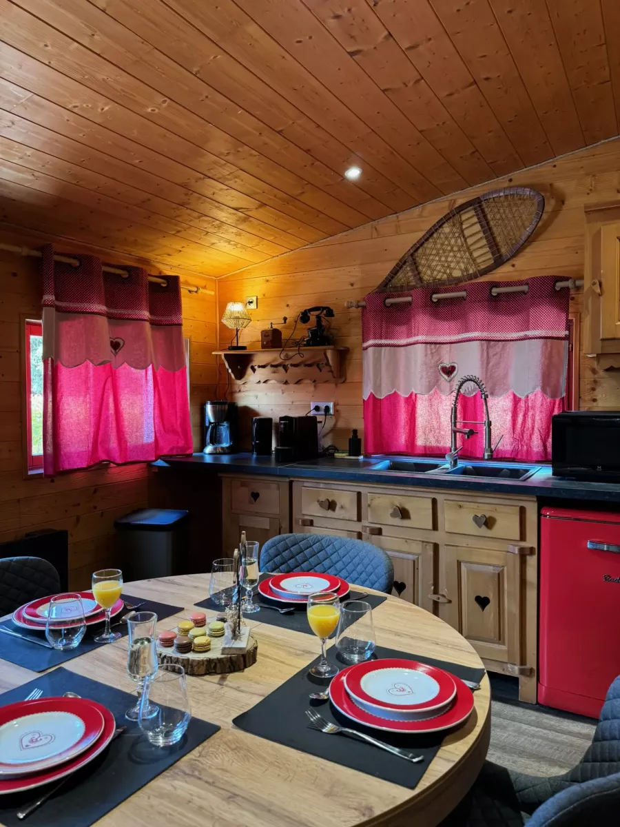- Une grande pièce à vivre avec cuisine intégrée et équipée d’un grand frigo avec congélateur, plaque de cuisson et lave-vaisselle