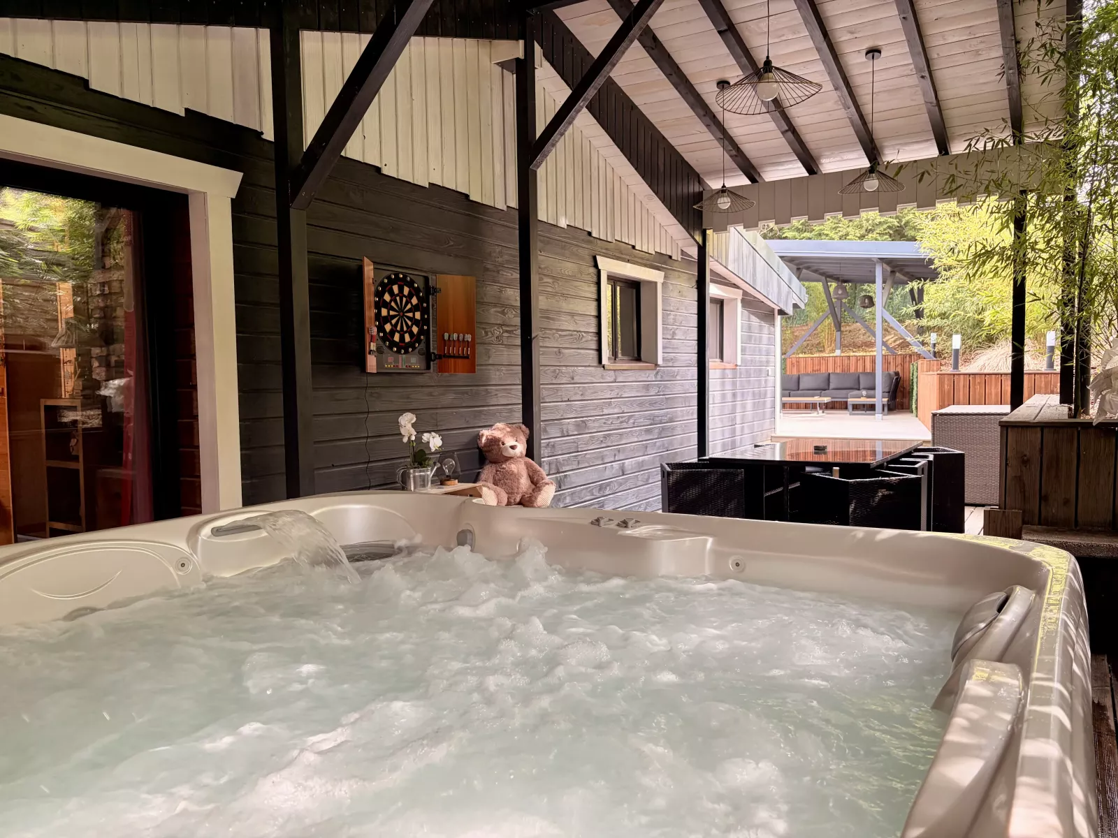 - Grand jacuzzi chauffé à 38°C accessible 24h/24h toute l’année, en toute intimité