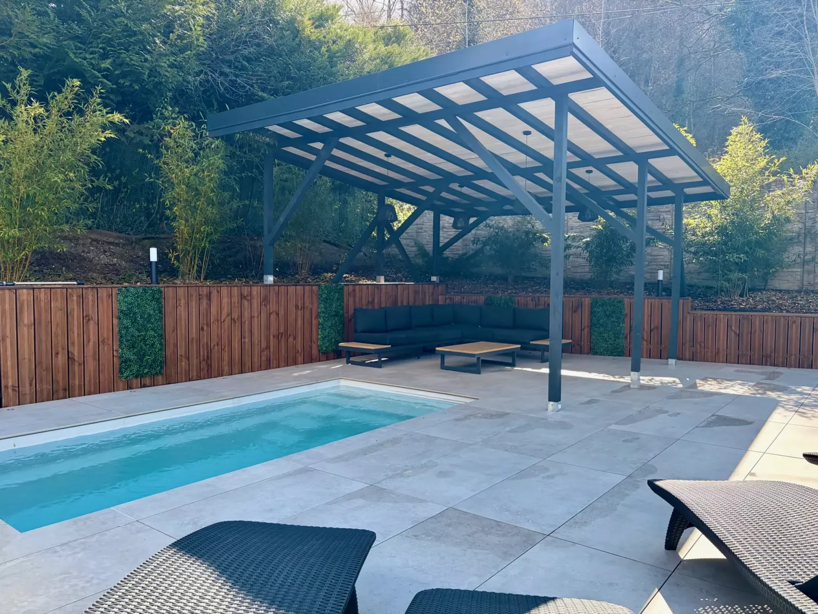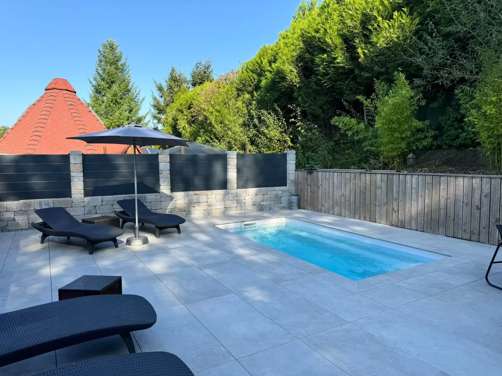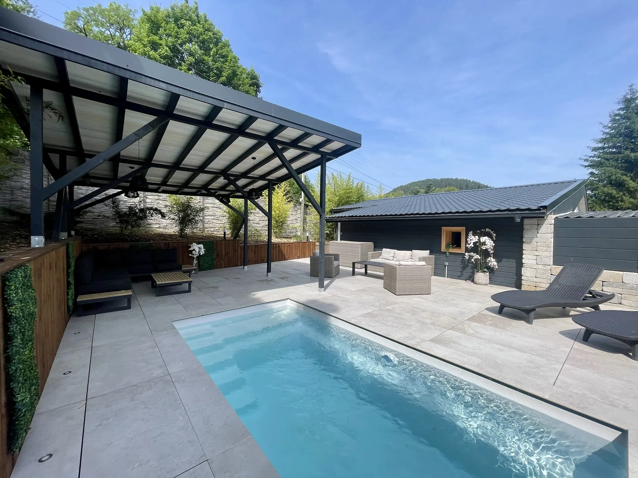 - Une grande terrasse avec piscine chauffée, en saison estivale et mobilier de jardin